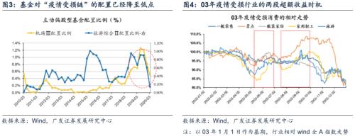 其次,20年“业绩修复弹性”在哪里?疫情受损链的景气与配置已双双触底,随着国内生产生活的渐次修复,参考03年疫情中后期的配置思路,结构性“报复性消费”的行业将迎来斜率陡峭的业绩修复与超额收益。当前形势(疫情企稳,至暗时刻过去)与03年“报复性消费”行情启动的第一段较为相似,结构上关注景气预期与配置双双触底的休闲服务/机场,并对五一黄金周的高频数据保持跟踪。