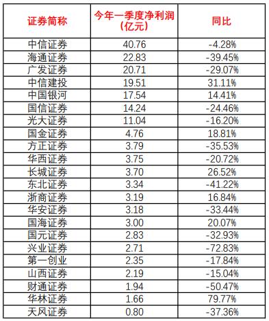 15家券商一季度净利润同比出现下滑,其中近一半券商降幅超过30%,分别为兴业证券(行情601377,诊股)、财通证券、东北证券、海通证券、天风证券、方正证券(行情601901,诊股)、华安证券(行情600909,诊股)和国元证券(行情000728,诊股),同比降幅分别为72.83%、50.47%、41.22%、39.45%、37.36%、35.53%、33.44%和32.93%。