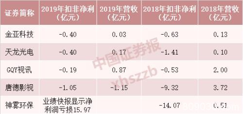 在目前的创业板股票中,“扣非净利润为负且营业收入低于1亿元”的个股共有4只,分别是金亚科技、天龙光电(行情300029,诊股)、GQY视讯(行情300076,诊股)、唐德影视(行情300426,诊股)。此外,尚未公布年报的神雾环保,业绩快报显示其亏损15.97亿元,2018年扣非净利润为负且营业收入低于1亿元。