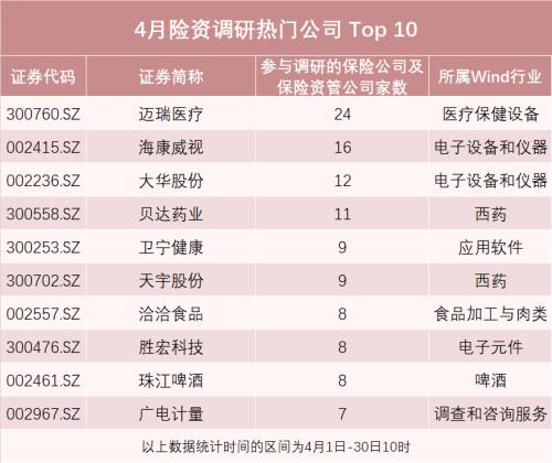 行业来看,电子科技、医疗医药两大板块颇受险资青睐。个股方面,医疗保健设备行业的迈瑞医疗(行情300760,诊股),4月以来已有24家险资调研,排名第一;电子设备和仪器行业的海康威视(行情002415,诊股)和大华股份(行情002236,诊股)分别排名第二和第三,分别有16家、12家险资调研。