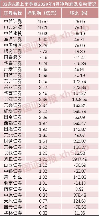 从净利润情况看,4月33家上市券商累计实现净利润129.8亿元。就单家情况而言,净利润超过1亿元的有28家,净利润超过5亿元的券商有11家。位列前三的分别是中信证券15.57亿元、申万宏源15.20亿元、中信建投10.39亿元,也是仅有的3家净利润超10亿元的券商。