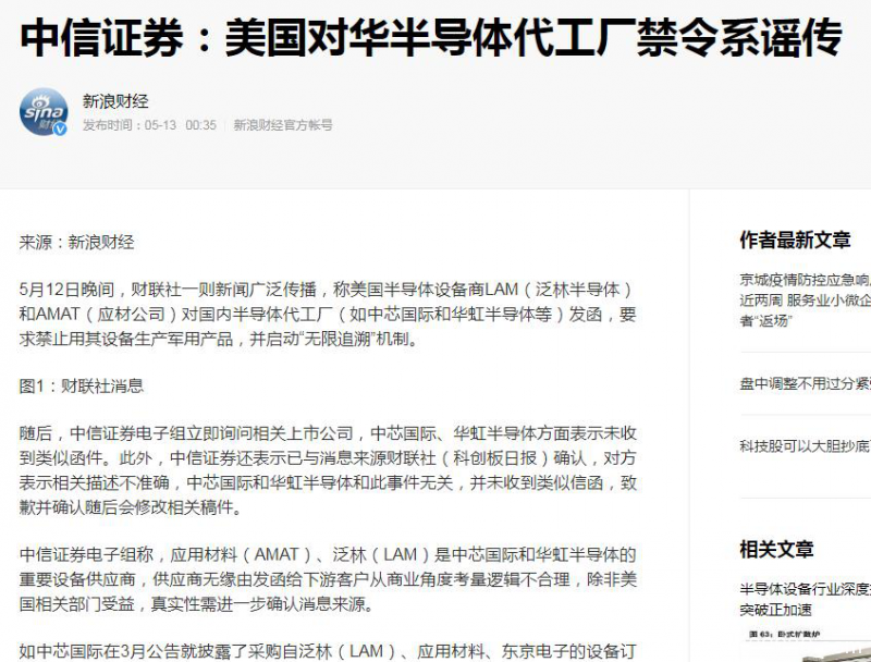随后多家媒体报道称,中信证券电子点评如下:我们和消息来源确认后,对方确认描述不准确,中芯国际和华虹半导体和此事件无关,并未收到类似信函,致歉并确认随后会修改相关稿件。我们也已询问相关上市公司,中芯国际、华虹半导体方面也并未收到类似函件。