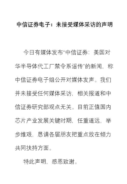 今日午间,中信电子徐涛团队通过公众号“CITICS电子研究”发布声明称,今日有媒体发布“中信证券(行情600030,诊股):美国对华半导体代工厂禁令系谣传”的新闻。我们并未接受任何媒体采访,相关报道和中信证券研究部观点无关。