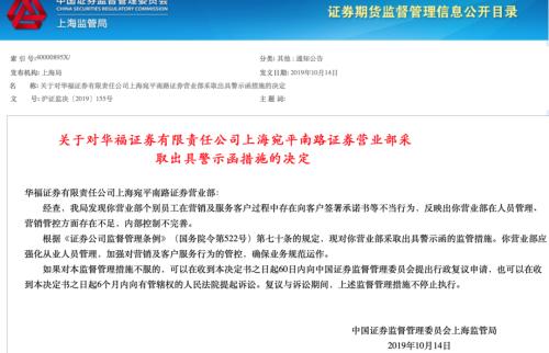 2019年10月,上海证监局就发现,华福证券上海宛平南路证券营业部个别员工,在营销及服务客户过程中存在向客户签署承诺书等不当行为,反映出该营业部在人员管理、营销管控方面存在不足,内部控制不完善。