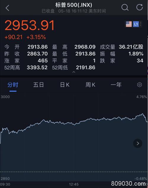 截至收盘,美股全线收高,道指涨3.85%,纳指涨2.44%,标普500指数涨3.15%。