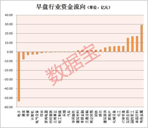 从板块资金流向看,电子行业资金净流出额最高,达54亿元,有色金属、食品饮料和国防军工板块均获净流入超15亿元。