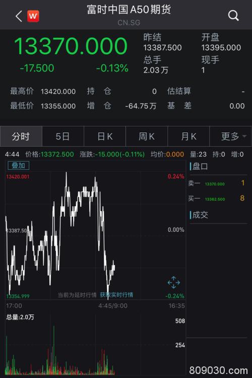 19日夜盘,富时A50指数期货微跌。据Wind数据,富时A50指数期货跌0.13%,收于13370.00点。