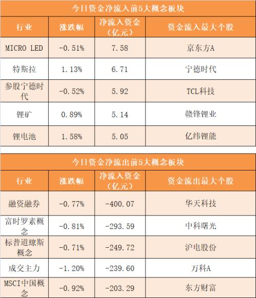 概念板块方面,周三MICRO LED、特斯拉、参股宁德时代(行情300750,诊股)、锂矿等概念板块资金呈现净流入,其中MICRO LED概念净流入7.58亿元居首。