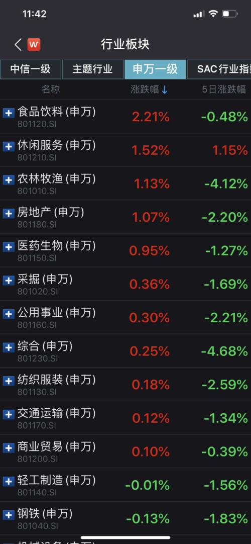 从盘面上来看,申万一级28个行业中有11个行业上涨,食品饮料、休闲服务、农林牧渔行业涨幅居前,分别上涨2.21%、1.52%、1.13%;科技板块调整,通信、电子、计算机行业跌幅居前,分别下跌2.25%、2.11%、1.40%。