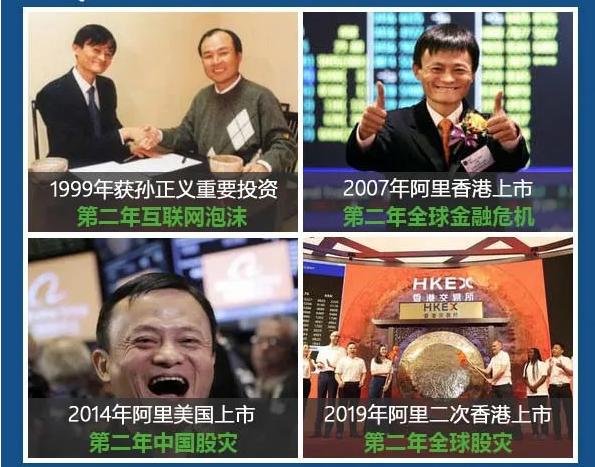 阿里巴巴在1999年获得孙正义早期投资后的第二年,全球股市便遭遇互联网股灾,2007年在香港第一次上市时,隔年全球便发生了金融危机,2014年在美国上市,A股则在第二年遭遇股灾,去年阿里巴巴在港交所二次上市后,美股在今年三月遭遇了熔断的股灾,与上文的丁蟹效应形成了良好的共振效应。