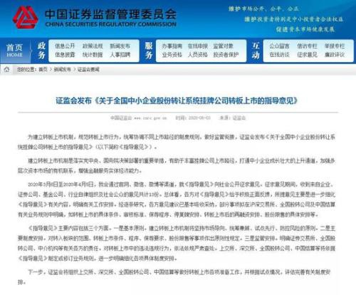 6月3日晚间,证监会发布《关于全国中小企业股份转让系统挂牌公司转板上市的指导意见》。