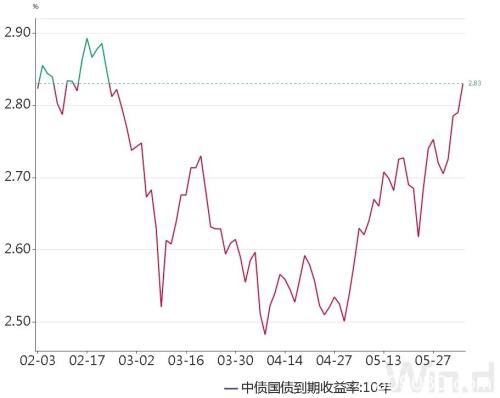 Wind数据显示,6月4日,10年期国债收益率上行至2.8301%,从4月8日阶段低点已上行0.3477个百分点(34.77个基点),且高于春节假期过后第一个交易日2月3日的2.8231%,已完全回吐春节后利率下行空间。