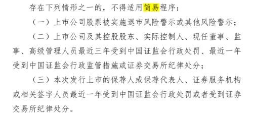 根据券商中国记者查阅《再融资审核规则》,存在3类情形之一的,不能使用简易程序,比如上市公司股票被实施退市风险警示或其他风险警示。