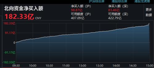 截至收盘实际净买入182.33亿元,为历史次高,仅次于2019年11月26日创造的214亿元。其中沪股通净买入98.87亿元,深股通净买入83.46亿元。
