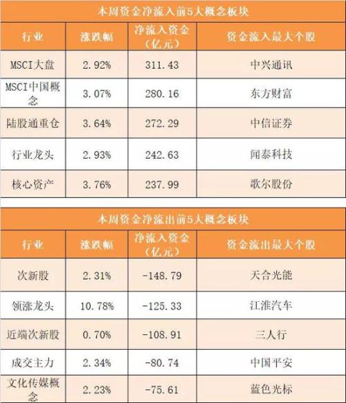 概念板块方面,本周MSCI大盘、MSCI中国概念、陆股通重仓、行业龙头等概念板块资金呈现净流入,其中MSCI大盘概念净流入311.43亿元居首。