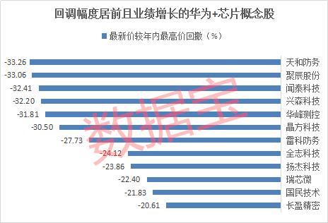 3月以来,华为+芯片概念股迎来普遍回调,30股的最新价较年内最高点的回撤幅度超过30%。2019年的牛股汇顶科技(行情603160,诊股)累计回调了45%,回撤幅度最大。今年一季度公司业绩低于预期,净利润同比下滑超50%。在年内回调幅度超过20%的公司中,12家公司去年年报和今年一季报业绩均实现正增长,其中天和防务(行情300397,诊股)、聚辰股份(行情688123,诊股)、闻泰科技等回调幅度居前。