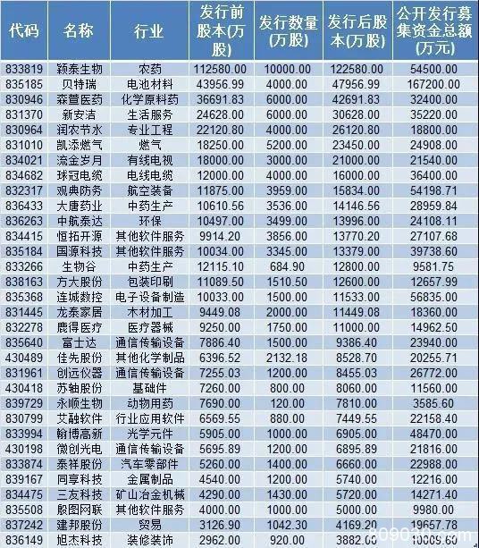 在公开发行完成后,18家公司股本规模过亿,颖泰生物总股本为12.26亿股,贝特瑞、森萱医药股本均超过4亿股。而旭杰科技公开发行后总股本为3882万股。
