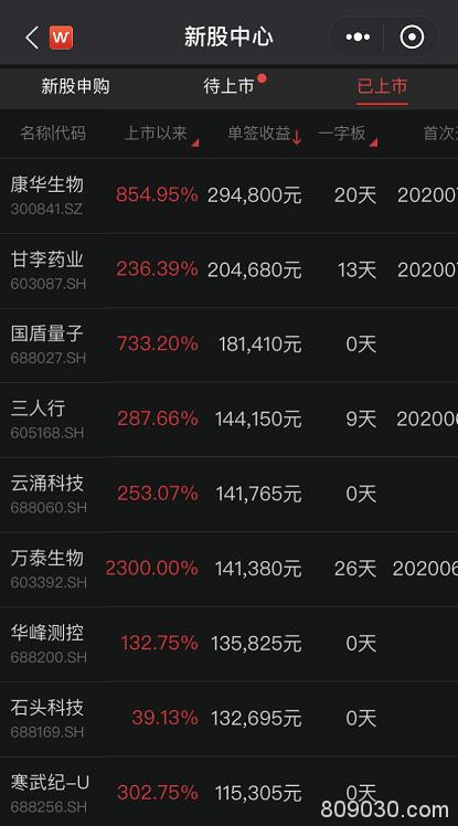 新股赚钱效应爆棚,一签赚10万、20万的频出,生物医药股康华生物、甘李药业(行情603087,诊股)分别一签赚29万、20万。国盾量子、三人行(行情605168,诊股)、云涌科技(行情688060,诊股)、万泰生物(行情603392,诊股)等也一签赚超10万元,其中国盾量子、云涌科技等多只为科创板。