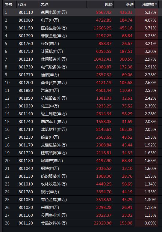 盘面上,申万一级28个行业板块全线上涨,无一下跌。家电、电子和医药生物行业领涨,涨幅分别达到5.37%、4.07%、3.71%,共有16个行业涨幅超过2%,其中,电子和医药生物行业的成交额均超过1000亿元。