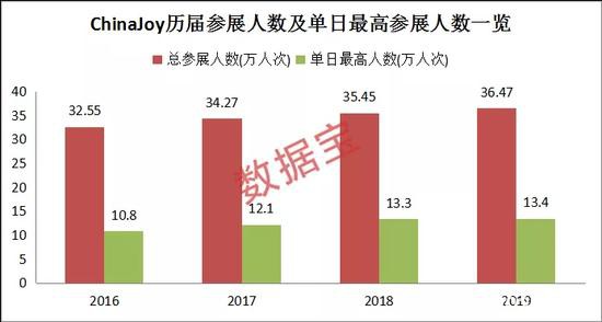 过去5年,ChinaJoy参展人数逐年上升,2019年达到36.47万人,单日参展人数创历史新高。