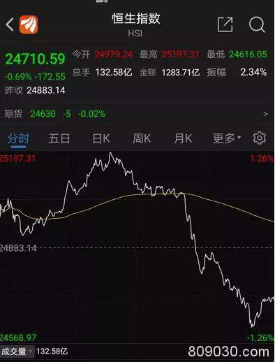 A股收盘后,外围市场走软。恒生指数从早盘超1%,到午盘跳水至跌超1%,盘中最高振幅达581点,截至收盘跌幅为0.69%,金融股和科技股纷纷走弱。