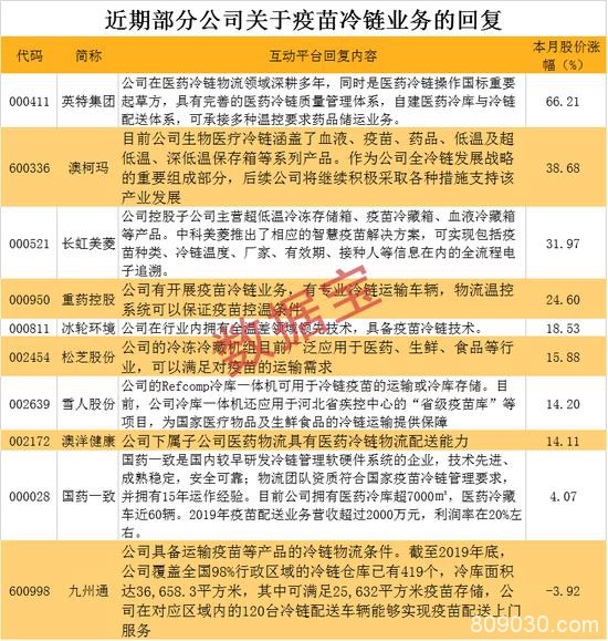 随着疫苗冷链技术成为市场关注的热点,A股多家上市公司近日在互动平台上就其业务布局进行了回复。股价表现来看,龙头英特集团本月股价已累计上涨66.21%,牛气冲天,澳柯玛、长虹美菱(行情000521,诊股)和重药控股月内涨幅均超过20%。