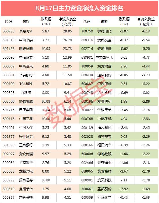 个股方面,118股主力资金净流入超亿元。其中京东方A净流入29.85亿元, 资金流入规模居首,股价上涨5.87%。中国平安(行情601318,诊股)上涨3.72%、资金净流入26.2亿元。