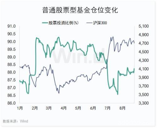 从细分类型看,股票型基金中,普通股票型基金仓位为88.25%,较8月初上升0.34个百分点;混合型基金中,偏股混合型基金仓位为84.33%,较8月初上升0.16个百分点,较7月初上升1.86个百分点。