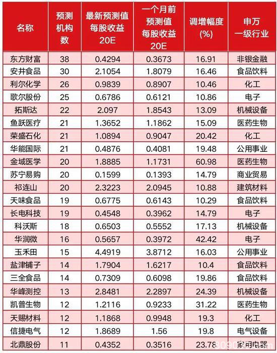 另外,食品饮料行业的安井食品(行情603345,诊股);机械设备行业的科沃斯(行情603486,诊股)、拓斯达(行情300607,诊股);化工行业的御家汇(行情300740,诊股)、利尔化学(行情002258,诊股);非银金融行业的东吴证券(行情601555,诊股)、东方财富(行情300059,诊股)等同样获得券商给予业绩预期较高幅度调增。(见表1)
