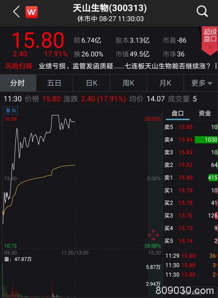 当天上午,天山生物再度冲高,盘中一度涨停。此前连续6日涨停,本周前三日均涨20%。连续9个交易日,天山生物已经大涨超180%。截至午盘,天山生物涨超17%。