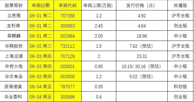 本周周二(9月1日)到周五(9月4日),共有来自科创板、沪市主板、中小板、创业板等9只新股发行。其中9月1日周二发行的沪市主板新股立昂微,芯片股发行价为4.92元,或将有较大涨幅。