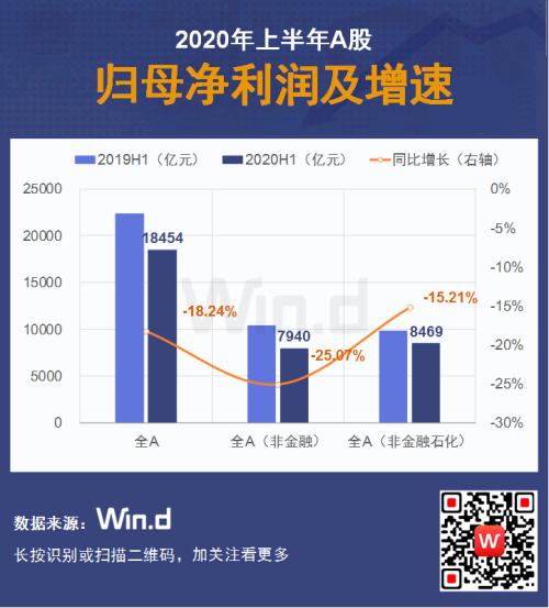 2020年上半年全部A股上市公司实现归属于母公司净利润1.85万亿元,同比下降18.24%。剔除金融后,上半年A股净利润为7940.05亿元,同比下降25.07%;剔除金融石油石化后,A股净利润为8468.73亿元,同比下降15.21%。