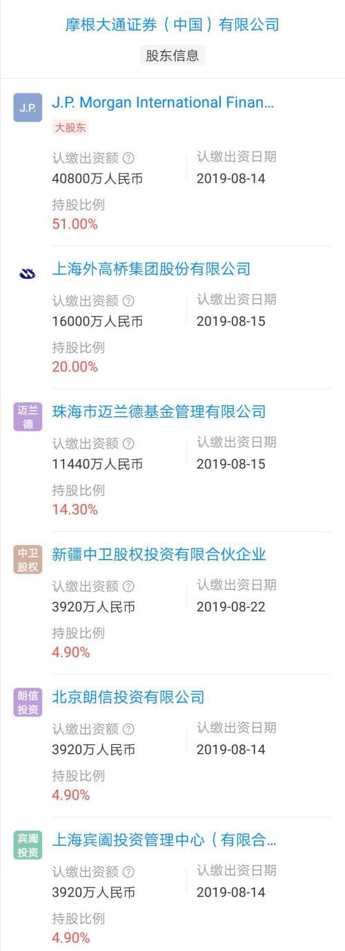同年8月22日,摩根大通证券完成工商登记,注册资本为8亿元,摩根大通国际金融有限公司持有51%股权,上海外高桥集团股份有限公司、珠海市迈兰德基金管理有限公司、北京朗信投资有限公司、新疆中卫股权投资有限合伙企业、上海宾阖投资管理中心(有限合伙)在内4家股东合计持有剩下49%股权。