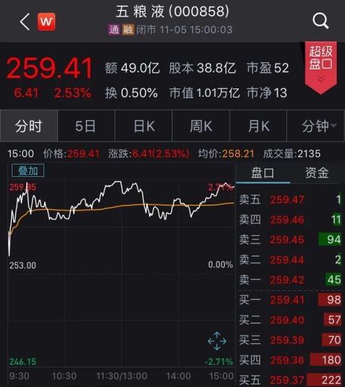 11月5日,A股再增万亿市值白酒公司。五粮液开盘走高,截至收盘报259.41元,创出历史新高259.7元价位,公司市值成功突破万亿大关,达到10084亿元。