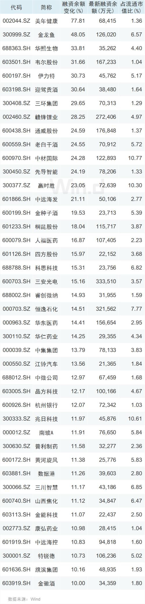 在两融余额回升的同时,部分公司融资余额亦快速增加。Wind统计显示,本周前三天,有42只个股融资余额增长超过10%、最新融资余额超2亿元,且占流通市值比超过1%。具体来看,美年健康(行情002044,诊股)融资余额增幅达77.81%,位居第一;此外,金龙鱼(行情300999,诊股)、华熙生物(行情688363,诊股)、韦尔股份(行情603501,诊股)、伊力特、迎驾贡酒、三环集团(行情300408,诊股)、赣锋锂业(行情002460,诊股)、通威股份(行情600438,诊股)、老白干酒、中材国际(行情600970,诊股)等公司融资余额增幅均超过20%。