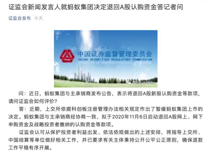 图片来源:证监会官微 11月5日,证监会新闻发言人答记者问表示,近期,上交所依据科创板注册管理办法相关规定作出了暂缓蚂蚁集团上市的决定。蚂蚁集团与主承销商经协商一致,拟于2020年11月6日启动退回A股网上、网下申购资金及战略投资者缴纳的认购资金等款项。