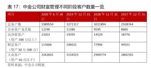 强大的投行业务,为其较早笼络了一批高端客户。2017 年 4 月中金公司完成对中金财富证券的收购后,充分利用中金财富证券广泛的线下服务网络,迅速扩大中低端客户规模(表17)。