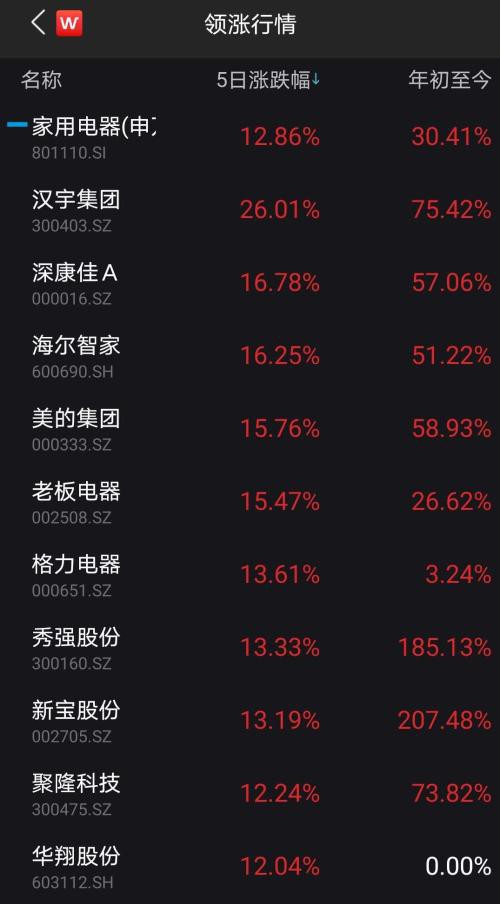从行业板块来看,Wind数据显示,本周申万28个一级行业中,家用电器板块以12.86%的涨幅超越汽车,成为本周行情领头羊。成分股中,汉宇集团(行情300403,诊股)全周大涨26.01%,深康佳A(行情000016,诊股)、海尔智家(行情600690,诊股)、美的集团(行情000333,诊股)、老板电器(行情002508,诊股)周涨幅也均超过15%,涨幅居前的,还有格力电器(行情000651,诊股)、秀强股份(行情300160,诊股)、新宝股份(行情002705,诊股)等。