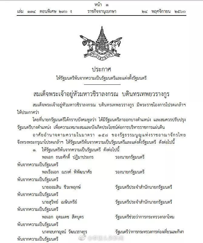 即日起生效。小编也为大家整理了详细的新内阁成员名单,快来认识一下泰国新一届总理部长们吧! ( 转载请注明出处 更多精彩内容来自泰国头条新闻)