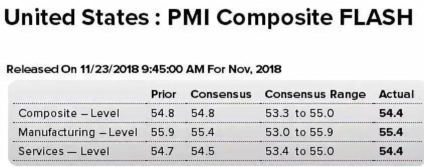 行业报告显示,11月MARKIT美国制造业采购经理人指数(PMI)初值低于预估和上月终值。11月MARKIT制造业PMI初值为55.4,预估为55.7,10月终值为55.7。11月MARKIT服务业就业指数降至2017年6月来最低。11月MARKIT综合PMI就业分项指数触及2017年6月来最低。