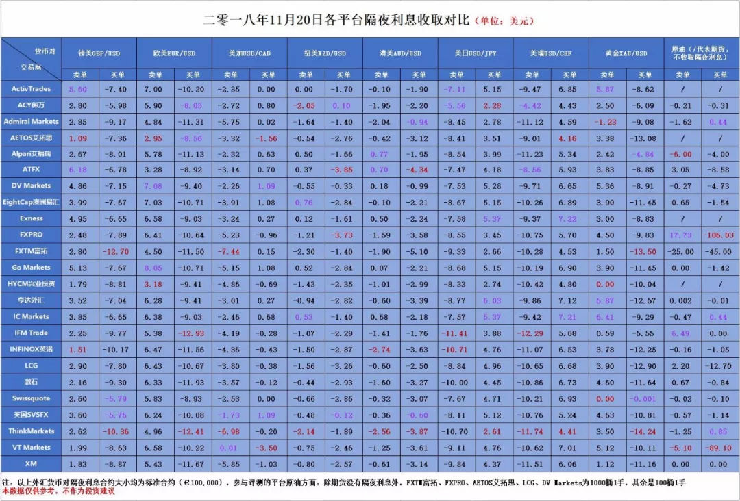 1.本次隔夜利息表是选取11月19日 – 20日交易1标准手的1天隔夜利息,单位均为美元。