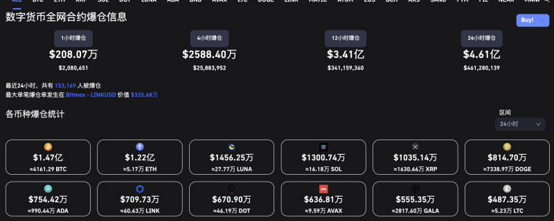 在24小时内,共有超15万人被爆仓,爆仓量为4.61亿美元,其中比特币清算了1.47亿美元,其次是1.22亿美元的以太币。